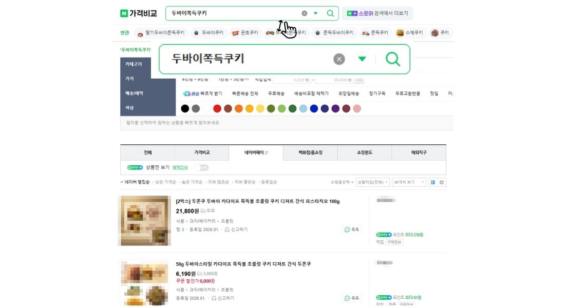 네이버 쇼핑에서 요즘 핫한 "두바이쫀득쿠키"를 띄어쓰기 없이 검색했습니다.