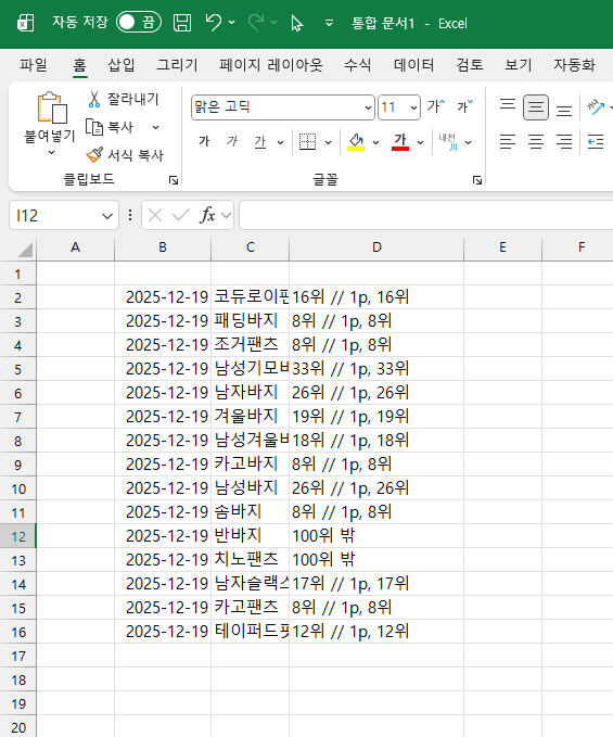 끝입니다. 날짜, 키워드, 순위가 예쁘게 칸 맞춰서 들어갑니다.